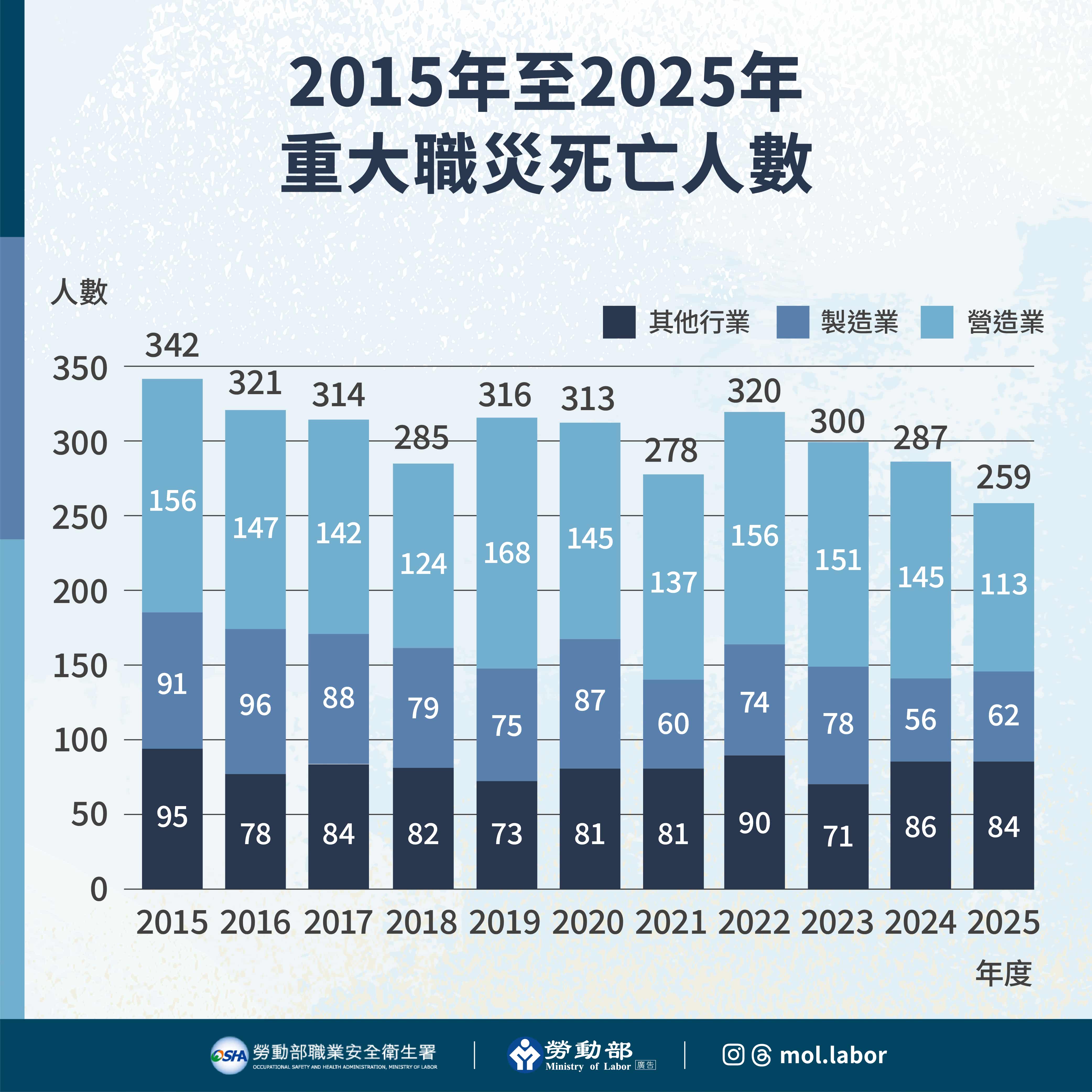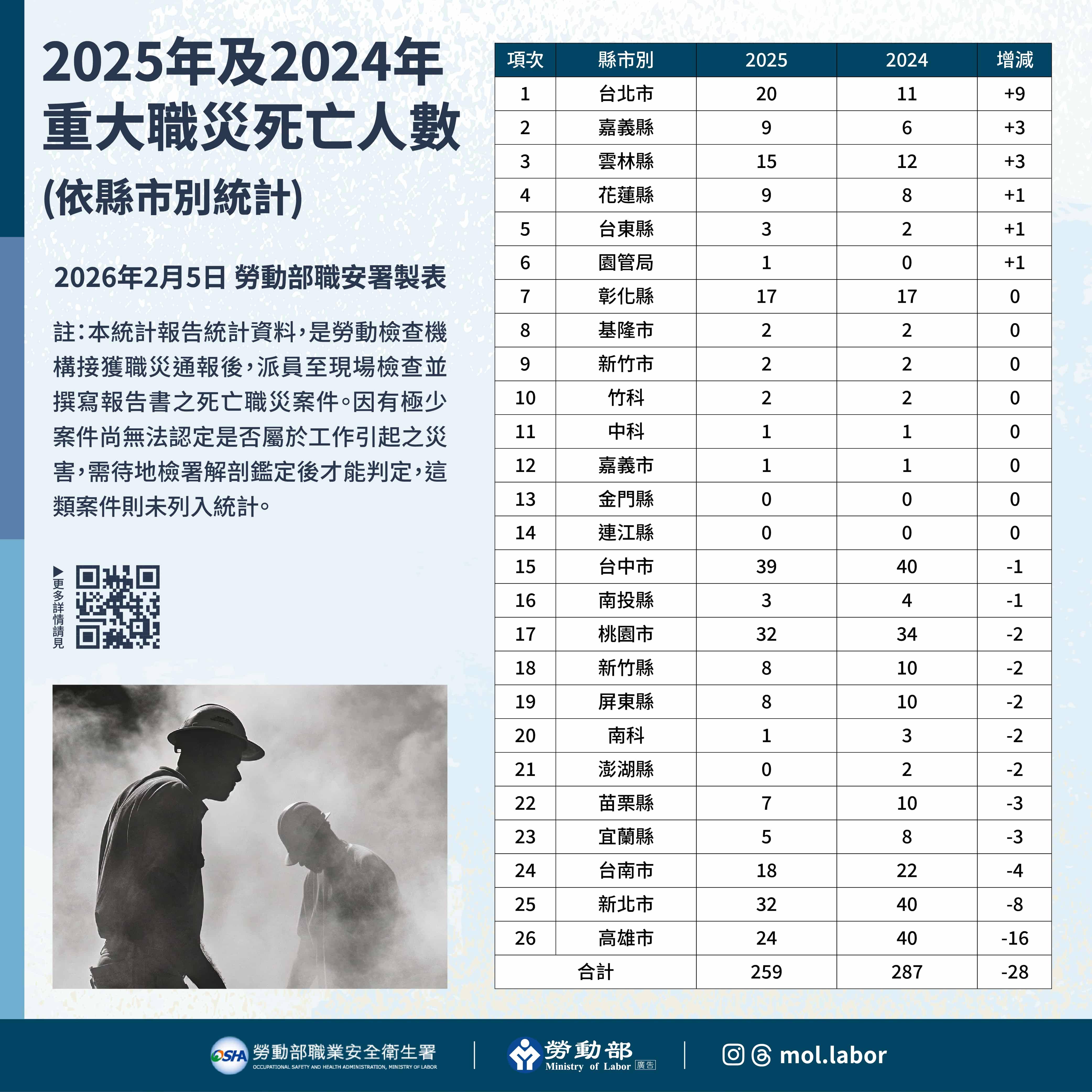 勞動部日前公布全國各縣市政府重大職業災害死亡人數統計,原公布死亡人數為251人,現更新為259人,較113年降低9.8%。原統計係依當時已完成通報及認定程序之案件彙整而成,惟部分案件陸續完成檢查程序及必要查核作業,或已取得解剖鑑定報告書,故相關統計數據配合更新,以精確呈現統計資料供社會大眾監督。
