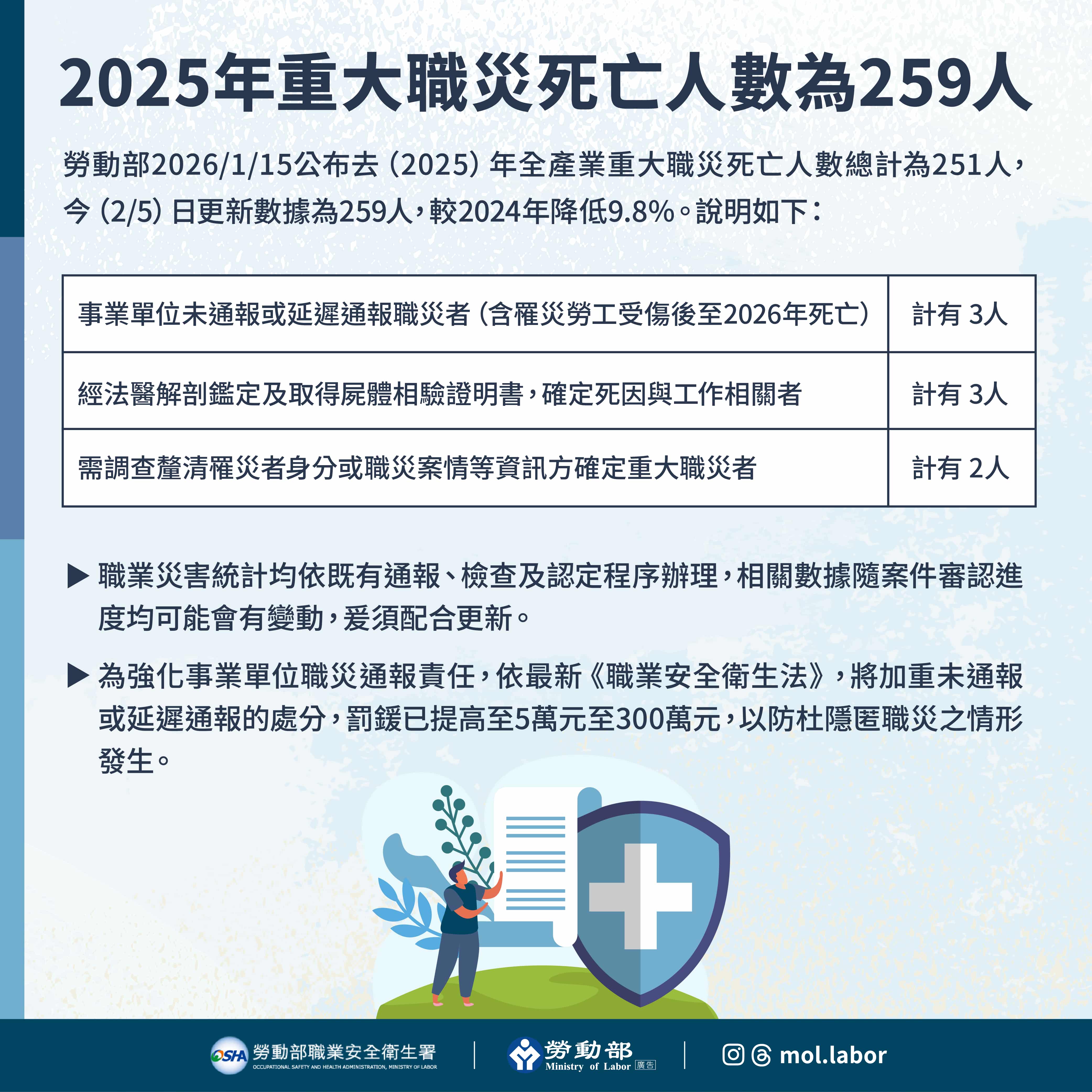 勞動部補充說明,職業災害統計均依既有通報、檢查及認定程序辦理,相關數據隨案件審認進度均可能會有變動,爰須配合更新。另為強化事業單位職災通報責任,依114年12月19日修正公布之職業安全衛生法規定,將加重未通報或延遲通報之處分,罰鍰由3萬元至30萬元提高至5萬元至300萬元,以防杜隱匿職災之情形發生;同時,也已要求各勞動檢查機構於接獲職災通報後應依規定儘速完成系統登錄及處理確認,以利勞動部即時掌握重大職災案件之發生及檢查處理情形,除定期對外公布讓公眾監督外,並適時檢視相應之減災策略俾滾動調整。未來各季統計資料,並將定期於該季結束後一個月於職安署官網-熱門連結之「職場重大職災/違法資訊公布專區」對外公布。(網址:https://www.osha.gov.tw/48110/48417/198096/198099/lpsimplelist